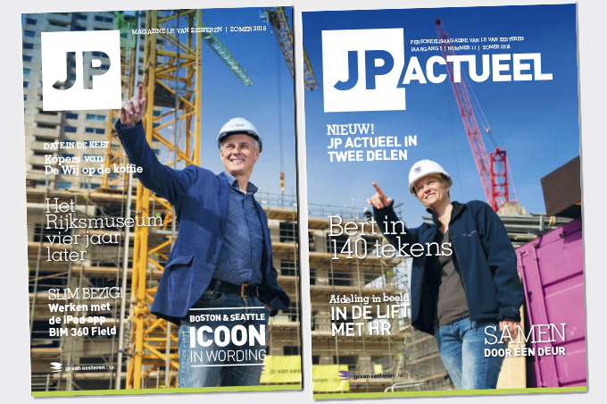 Ik schreef en fotografeerde al het complete interne magazine van bouwbedrijf JP van Eesteren. Dit jaar breidden we uit met een magazine voor de externe relaties. Als redactie bedachten we dat het leuk zou zijn om beide covers uit één beeld te laten bestaan. Met op de ene cover een externe relatie en op de ander een personeelslid. Dit is het resultaat! (De fraaie vormgeving is trouwens het werk van Stef Kuiper).