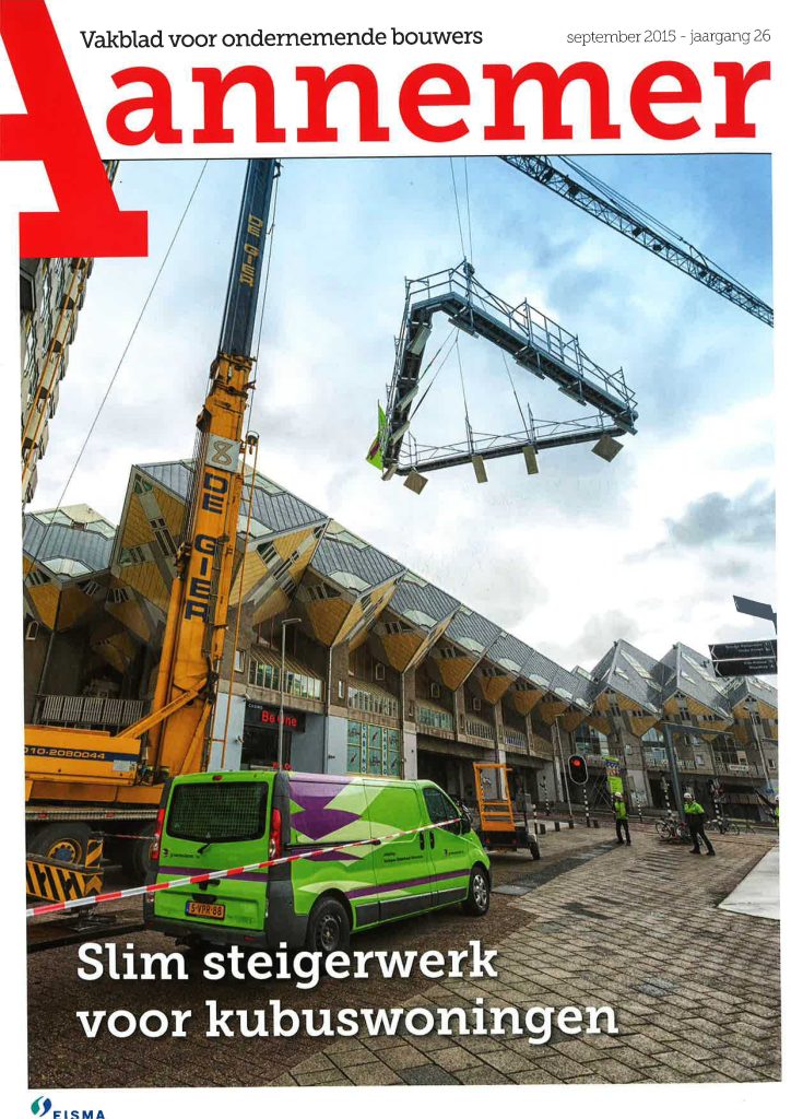 Eerder schreef ik al over de renovatie van de Rotterdamse kubuswoningen in het eigen magazine van bouwbedrijf J.P. van Eesteren. Nu werd ik opgetrommeld om persfoto’s te maken van de speciaal hiervoor ontwikkelde steiger. Een van de foto’s sierde daarna de cover van De Aannemer.